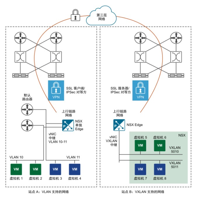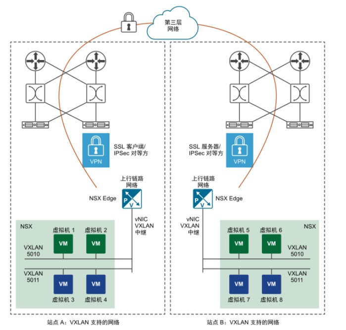 NSX Edge 支持在 NSX Edge 實例與遠(yuǎn)程站點之間實施點對點 IPSec VPN。在 NSX Edge 實例與遠(yuǎn)程 VPN 站點之間,支持證書身份驗證、預(yù)共享密鑰模式和 IP 單播通信。